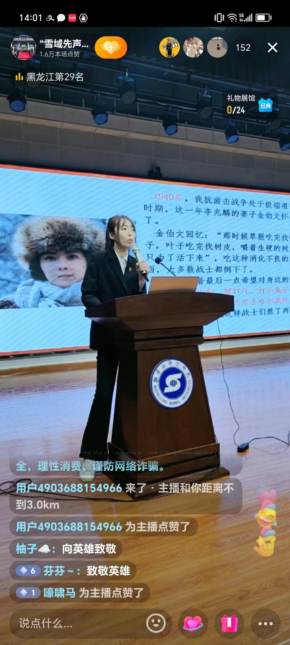 同时,此次宣讲线上直播环节也取得了良好的效果,我院也组织学生在线上进行了学习。本次线上直播共计获得6.3w点赞量,位于黑龙江人气榜第23位,观众们积极互动,致敬英雄,缅怀英烈。未来,我们将连接各地中小学,将东北抗联精神传播至祖国各地,让大家一起学思想,颂英烈!
