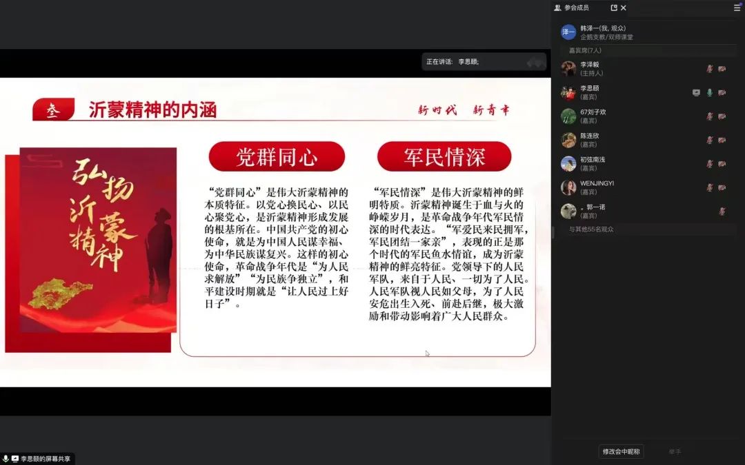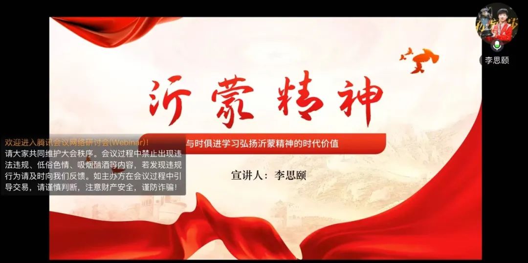 为传承红色基因,弘扬爱国主义精神,深入了解沂蒙精神的内涵与价值。我院“雪域先声”红色文化宣讲团与青岛科技大学经济与管理学院“寻韵红迹,青春铸魂”志愿宣讲团,于1月11日晚7时在线上联合开展沂蒙精神宣讲活动。本次活动由我院2024级研究生陈连欣主持,我院宣讲团成员李思颐、刘子欢,青岛科技大学宣讲团成员高露、郭一诺主讲,牡丹江师范学院马克思主义学院与青岛科技大学经济与管理学院2024级部分本科生参加。