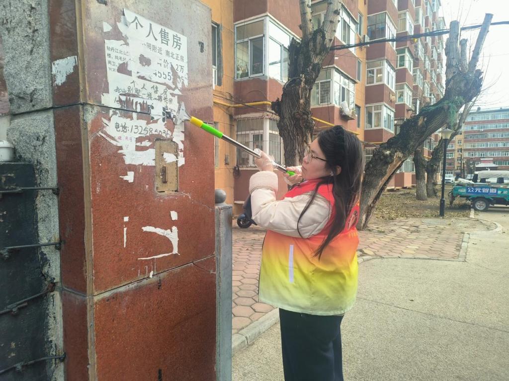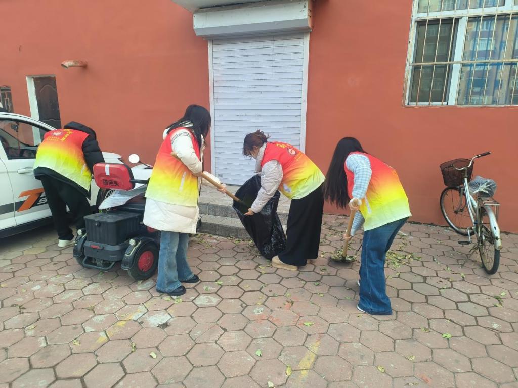活动伊始,志愿者们在泰安社区党群服务中心门口整齐集合,社区负责人为大家分发扫帚、铁锹、垃圾袋等劳动工具。随后,大家以饱满的热情投入到清扫工作中,相互之间分工协作,默契配合。有的手持扫帚,将凉亭和路面的落叶杂物一一清除;有的手持小铲子仔细铲除墙面的小广告;还有的深入草坪,耐心捡拾隐藏的杂物。寒风虽冷,却吹不散大家的劳动热情,志愿者们用自己的实际行动为社区环境改善贡献自己的力量。